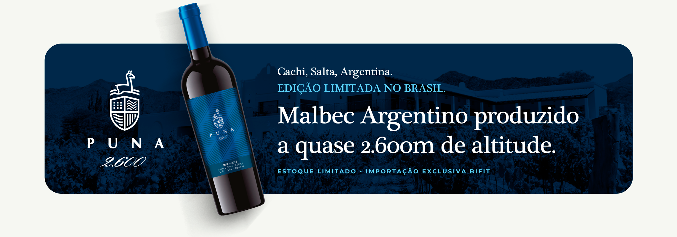 Malbec argentino de altitude extrema, elaborado pela Bodega Puna em Cachi, Salta, com vinhedos a quase 2.600 m. 100% Malbec, sem passagem por madeira, cor intensa, fruta vibrante e frescor de montanha em cada taça.
